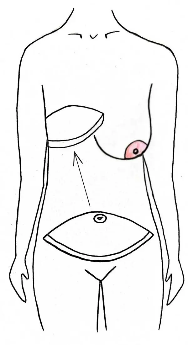One method of breast reconstruction involves removing skin and fat from the lower abdomen and transferring it—along with its vascular supply—to the chest area where the breast was previously located. This procedure can also be performed using a free flap, where the tissue is completely detached and reconnected via microsurgical vascular anastomosis at the new site.